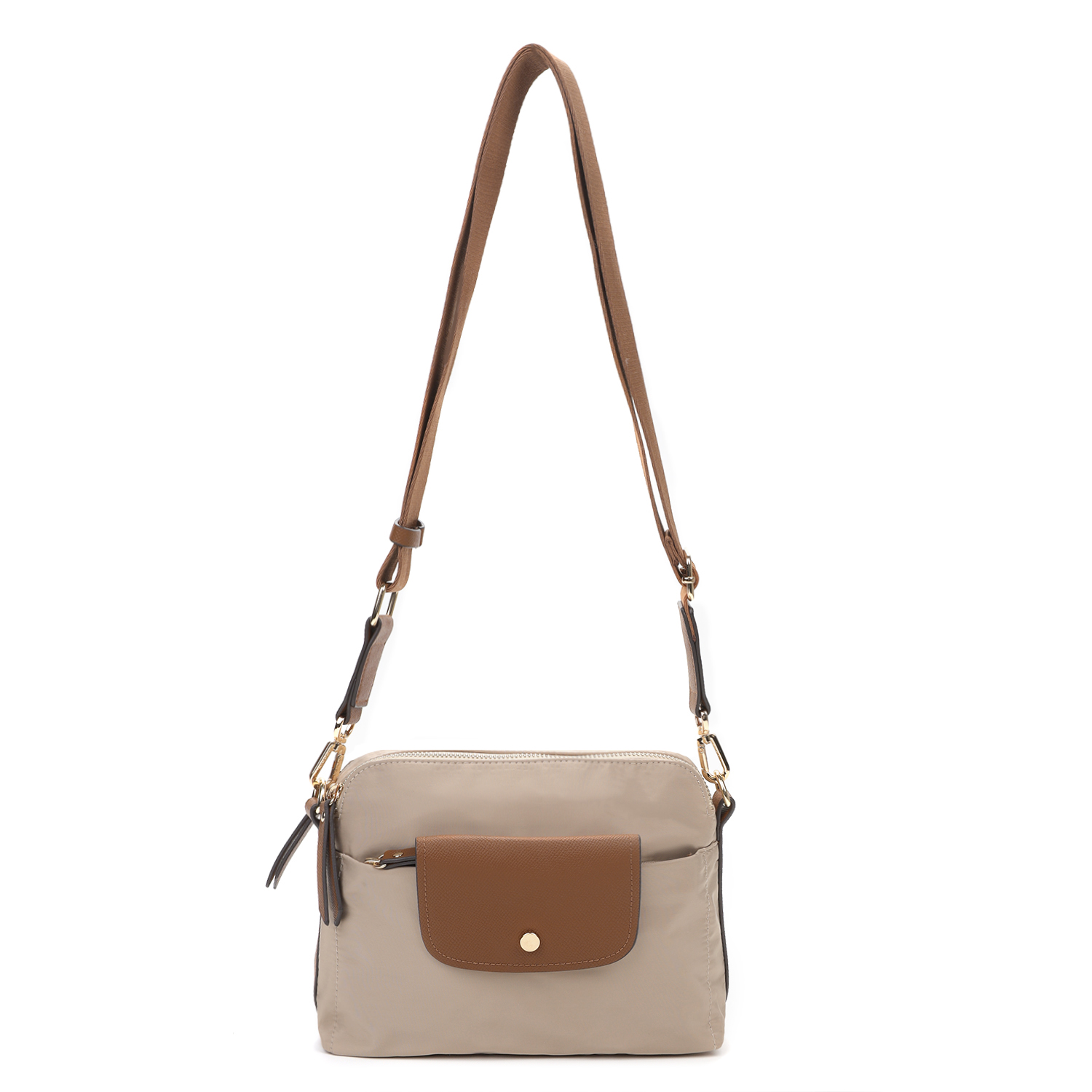 На лицевой стороне также сделан карман на молнии, дополнительно закрывающийся клапаном с кнопкой. Съемный текстильный ремень регулируется по размеру.