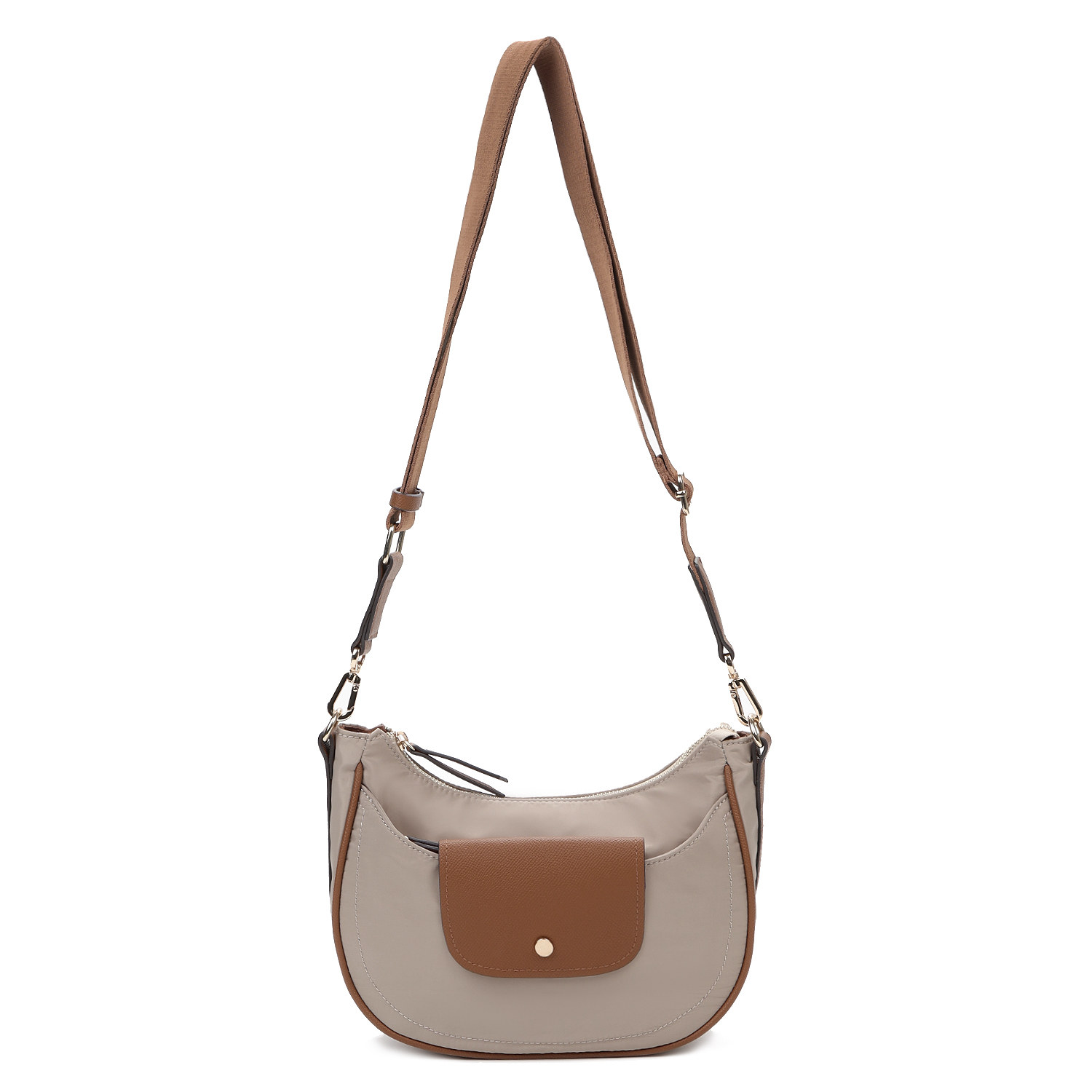 Изящная женская сумка кросс-боди в форме полумесяца из коллекции итальянского бренда FABRETTI в холодном серо-бежевом цвете. Стильная и продуманная модель, соответствующая мировым трендам сезона.