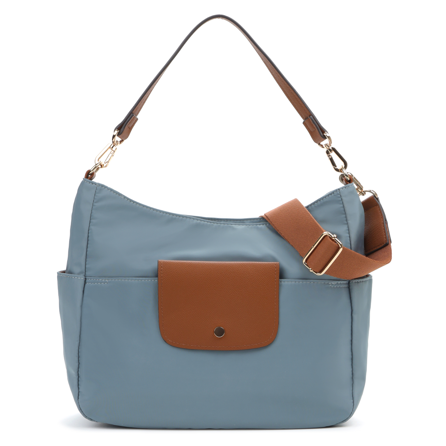 У сумки одно отделение, закрывающееся на молнию. Внутри два кармана – открытый и на молнии. На лицевой стороне открытый карман с клапаном на кнопке, на тыльной – карман быстрого доступа на молнии, по бокам небольшие открытые карманы. Сумка дополнена двумя видами съемных ручек – короткой ручкой из экокожи и регулируемым текстильным плечевым ремнем.